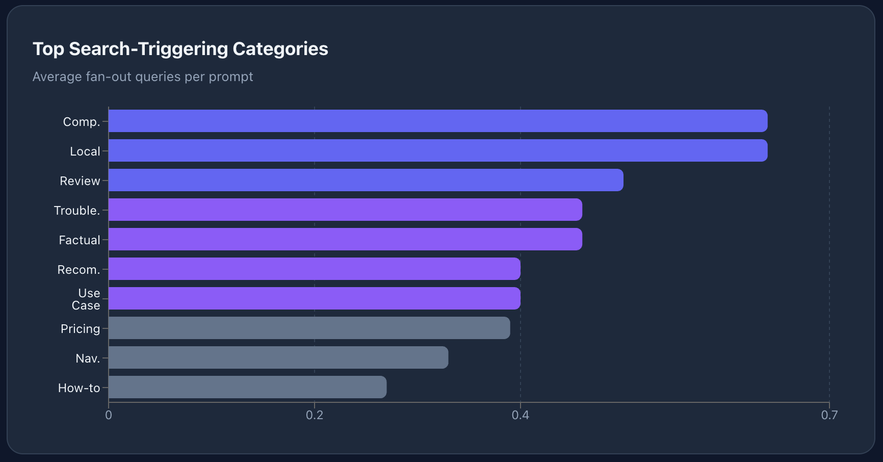 Comparison, pricing, reviews, and local queries — these are the categories where people are actively evaluating options and making decisions. And these are precisely the categories where ChatGPT reaches out to the web for fresh data. The AI is essentially telling you: "These are the queries where I need your help."